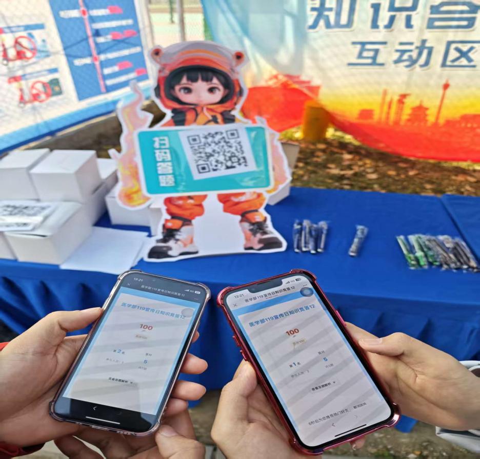在消防知识答题竞赛区,参与者通过扫描答题二维码,回答不同类型的消防知识题目,涵盖火灾成因、疏散逃生、灭火器使用等多个方面。回答有误的题目,工作人员会耐心讲解,化解同学们的疑惑,通过游戏强化知识掌握。