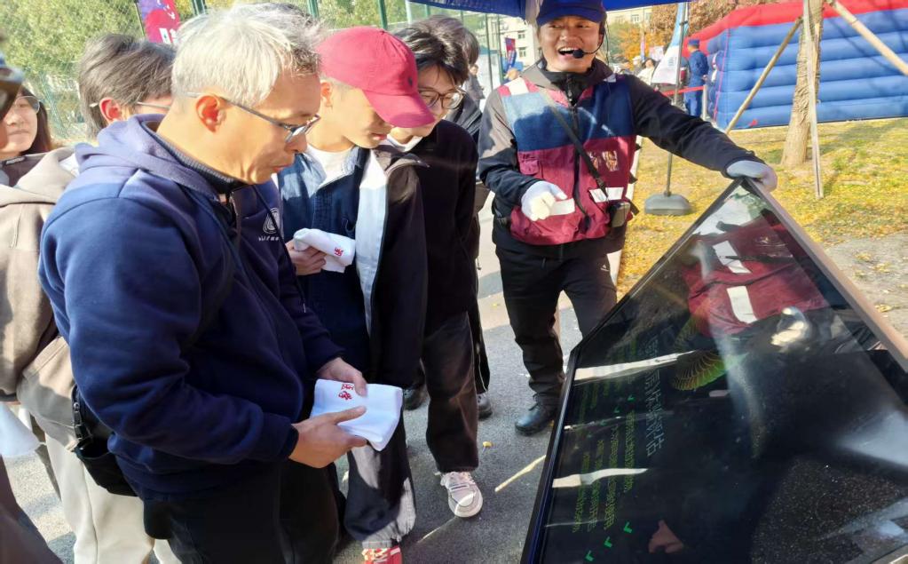 在体育馆北侧的活动场地上,帐篷与桌子整齐布置,鲜艳醒目的道旗和展板吸引了不少同学驻足。互动摊位前人头攒动,现场气氛热烈。